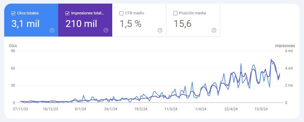 En este gráfico de Search Console, vemos como un sitio web se va posicionando a lo largo del tiempo y consiguiendo cada vez más impresiones y visitas, gracias a la aplicación de estrategias SEO.
